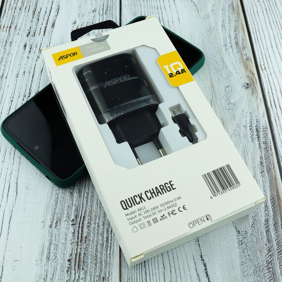 СЗУ Aspor A811 2USB 2.4A IQ + кабель Micro, чёрный