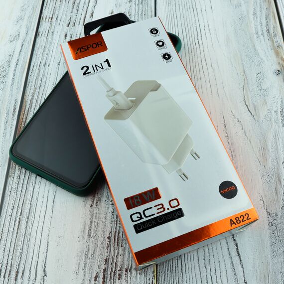 СЗУ Aspor A822 1USB 18W Fast Charger, QC 3.0+ кабель Micro белый
