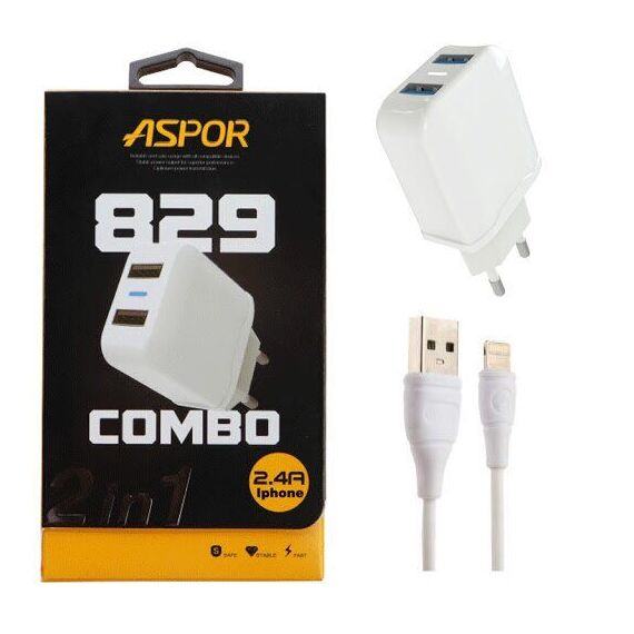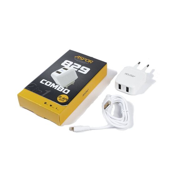 СЗУ Aspor А829 2USB + кабель Lightning (2.4A/IQ) Белый