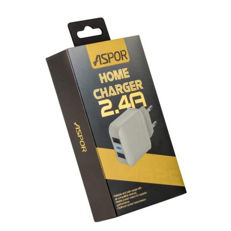 У СЗУ Aspor A829 огнестойкий пластиковый корпус белого цвета и 2 USB входа на верхнем торце. В адаптер встроена защита от перегрева, перегрузок и короткого замыкания. Интеллектуальное распределение зарядки выберет оптимальный ток заряда и определит время выключения.