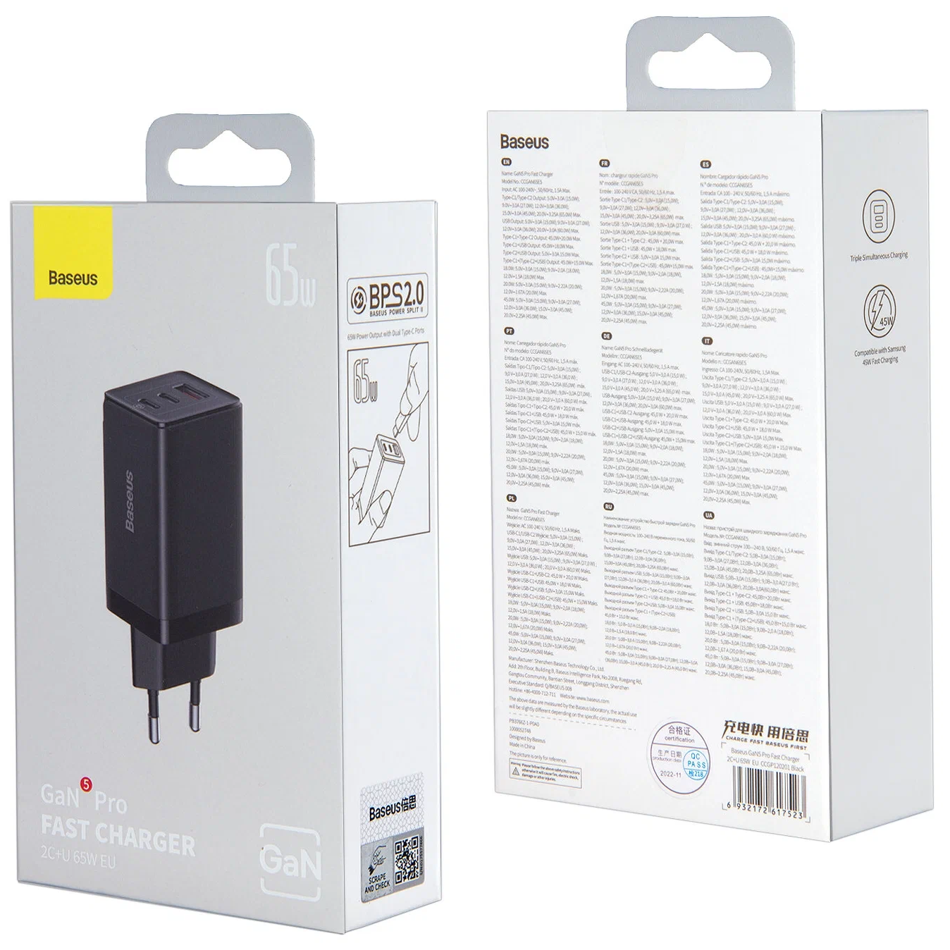 СЗУ Baseus GaN5 Pro CCGP120201 Fast Charger 2C+U 65W EU Cable Type-C to Type-C 1m Black