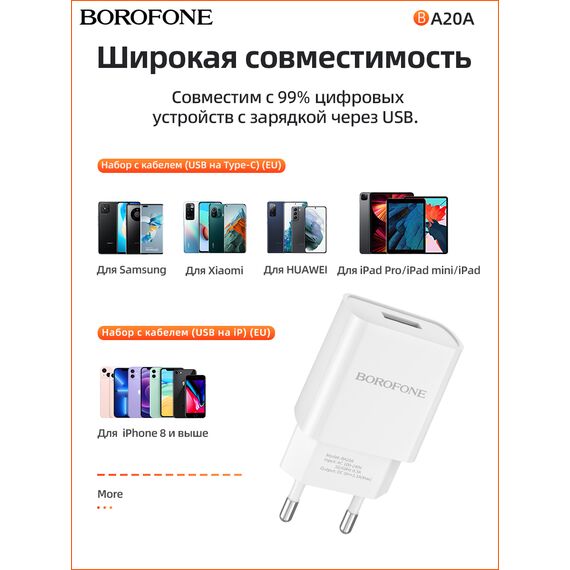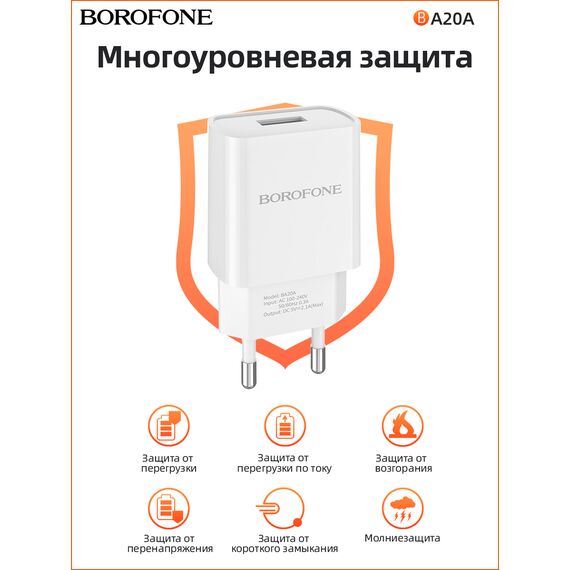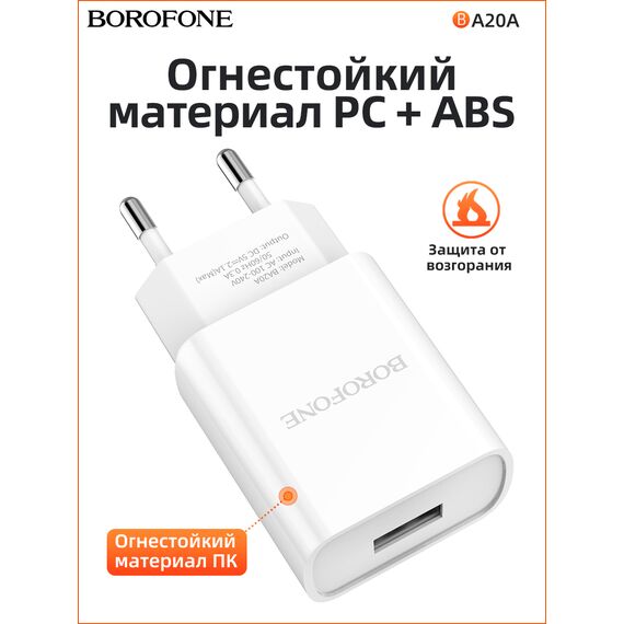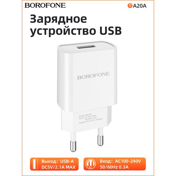 СЗУ Borofone BA20A 5V/2,1A 1USB Sharp single port, white (о)