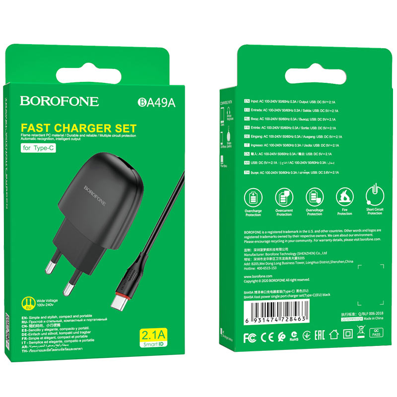 СЗУ Borofone BA49A Vast power single port 2.1A + Type-C cable, black