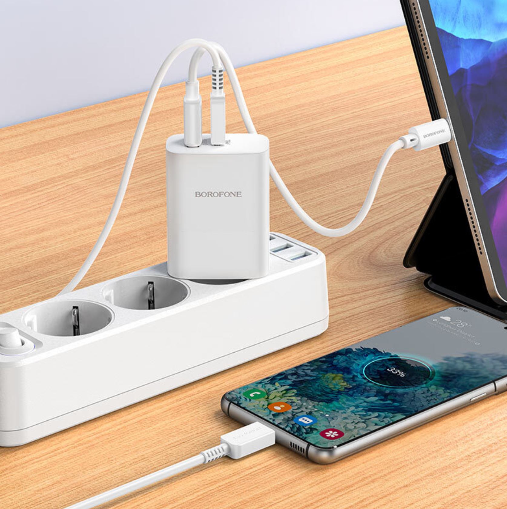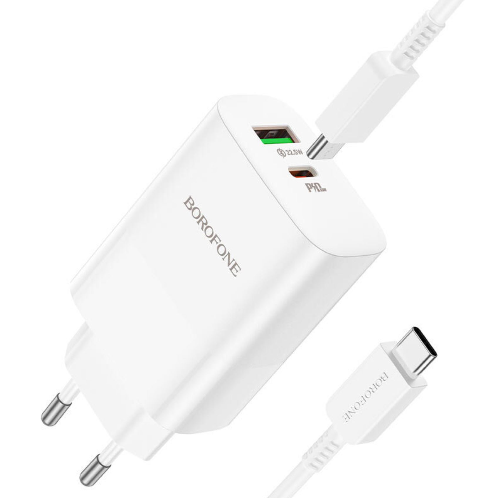 BOROFONE BN10 Sunlight, сетевое зарядное устройство с выходом USB-C 65W и USB 22.5W, вилка EU, поддержка протоколов быстрой зарядки, набор с кабелем USB-C на USB-C 100W
