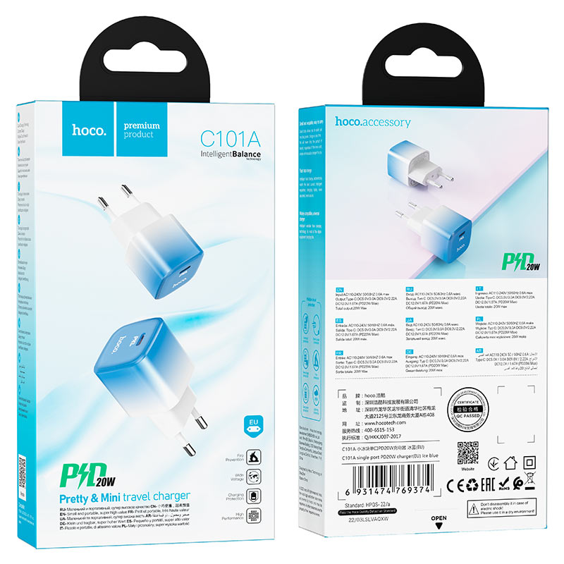 СЗУ Hoco C101A single port PD20W charger set+Type-C to lightning (EU), Ice blue