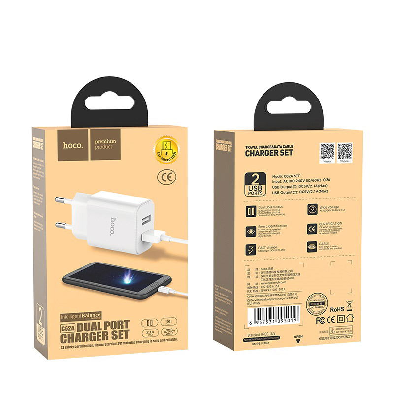 СЗУ Hoco C62A Victoria dual port +Micro 2.1A, white (о)