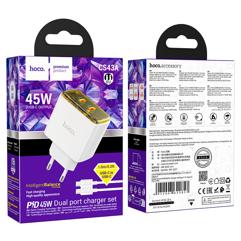 СЗУ HOCO CS43A Smart PD45W2C charger set Type-C + Type-C, EU, белый