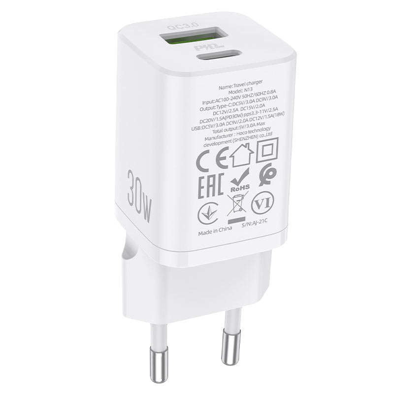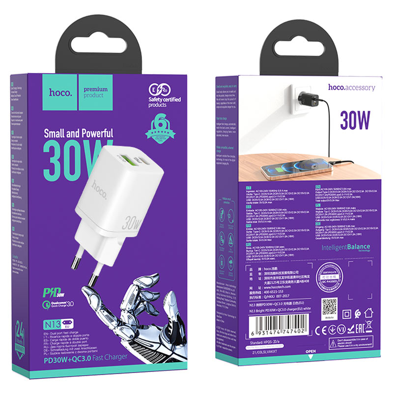 СЗУ HOCO N13 Bright PD30W+QC3.0 charger set(C to iP)(EU) (белый)