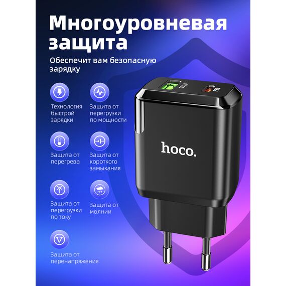 СЗУ HOCO N5 Favor dual port PD20W+QC3.0 charger set (C to iP),черный