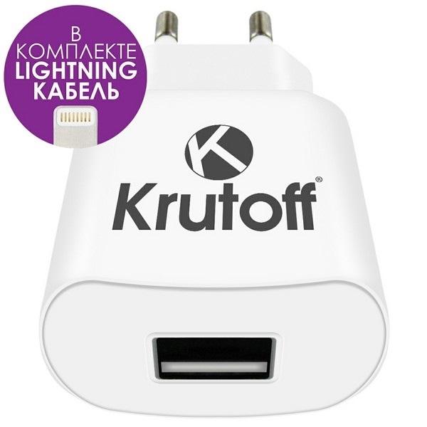 СЗУ Krutoff CH-14 1xUSB, 1A + кабель Lightningисключительно для подпитки гаджетов. Корпус зарядного устройства достаточно крепкий и надежный. Высококачественный пластик, из которого сделано устройство, гарантировано не содержит вредных веществ. Помимо прочего, простая монолитная форма делает зарядку менее чувствительной к повреждениям.
