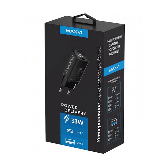 СЗУ Maxvi A402PD LED 33W, 1xUSB-A, 1xUSB-C, black
