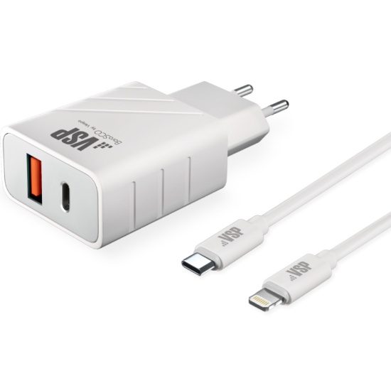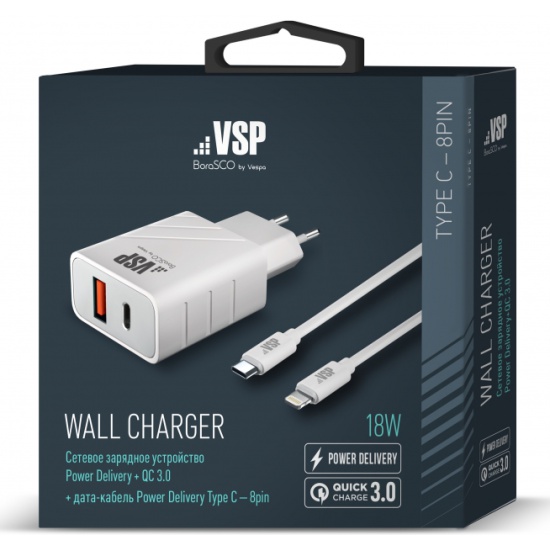 СЗУ Power Delivery + QC 3.0, 18W, + Дата-кабель Type-C - Type-C, 3А, 1м, белое, Borasco