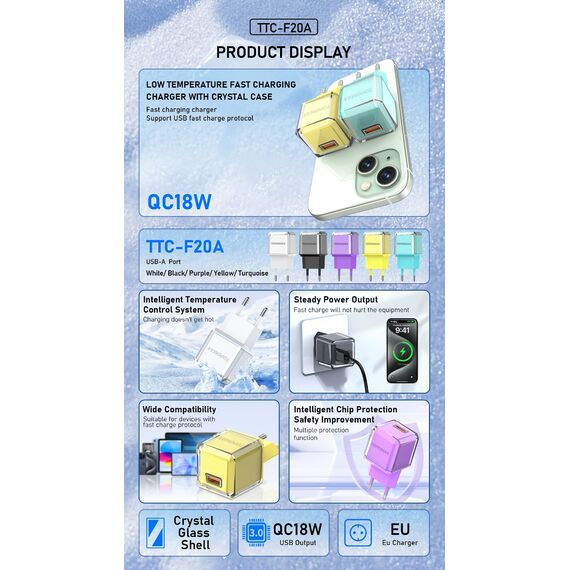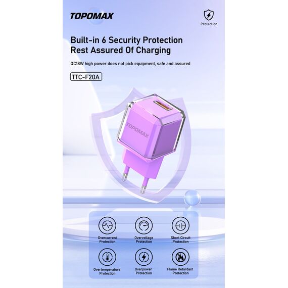 СЗУ TOPOMAX TTC-F20A Type-C QC 3.0, Fast Charger, USB-A, 18W + cabel Type-C purple