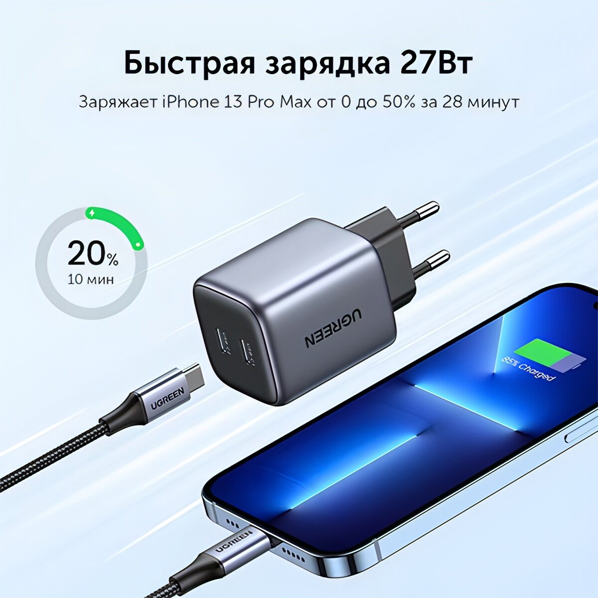 СЗУ Ugreen CD294 (90573) Nexode Mini USB-C+USB-C 45W PD GaN Fast Charger EU grey