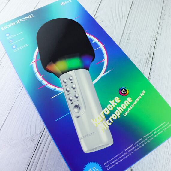 Караоке микрофон с RGB подсветкой BOROFONE BFK2, белый. Материал: ABS, паролон. Размер: 70*70*205 мм, вес: 283 г. Динамик: 50 мм, мощность: 5 Вт. Bluetooth 5.0; Чип:JL5. Емкость аккумулятора: 1200 мАч; 3 часа зарядки, 6 часов проигрывания. Поддержка подключения Bluetooth к мобильному телефону. Возможность установки TF-карта (micriSD), емкостью не более 32 г, для воспроизведения музыки. Воспроизведение музыки в качестве портативной Bluetooth колонки или через кабель AUX. Красивая яркая радужная RGB подсветка.