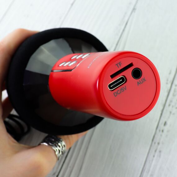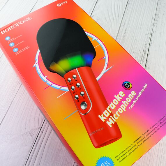 Караоке микрофон с RGB подсветкой BOROFONE BFK2, красный. Материал: ABS, паролон. Размер: 70*70*205 мм, вес: 283 г. Динамик: 50 мм, мощность: 5 Вт. Bluetooth 5.0; Чип:JL5. Емкость аккумулятора: 1200 мАч; 3 часа зарядки, 6 часов проигрывания. Поддержка подключения Bluetooth к мобильному телефону. Возможность установки TF-карта (micriSD), емкостью не более 32 г, для воспроизведения музыки. Воспроизведение музыки в качестве портативной Bluetooth колонки или через кабель AUX. Красивая яркая радужная RGB подсветка.