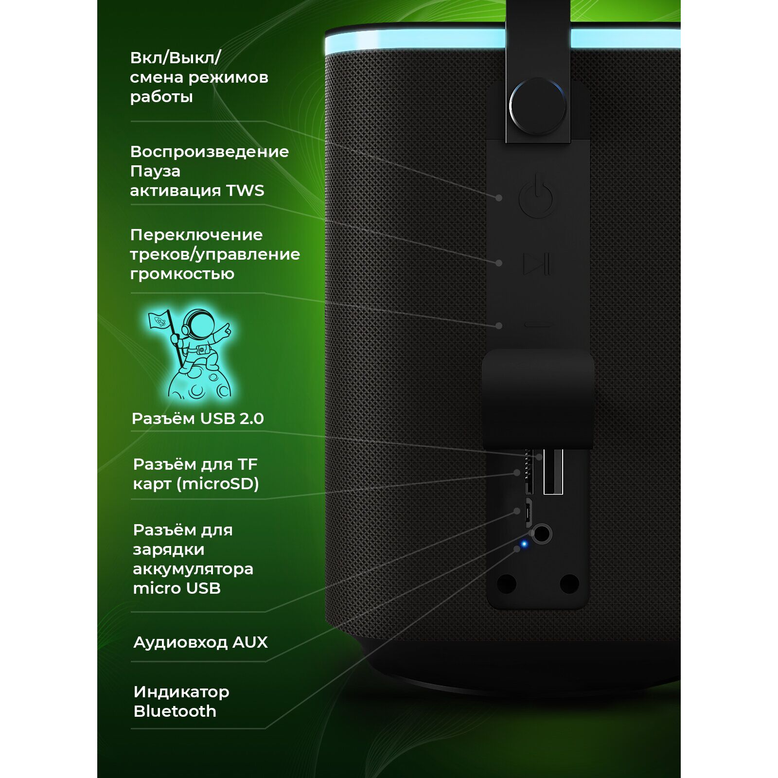 Воспроизведение: Bluetooth, microSD, AUX, USB