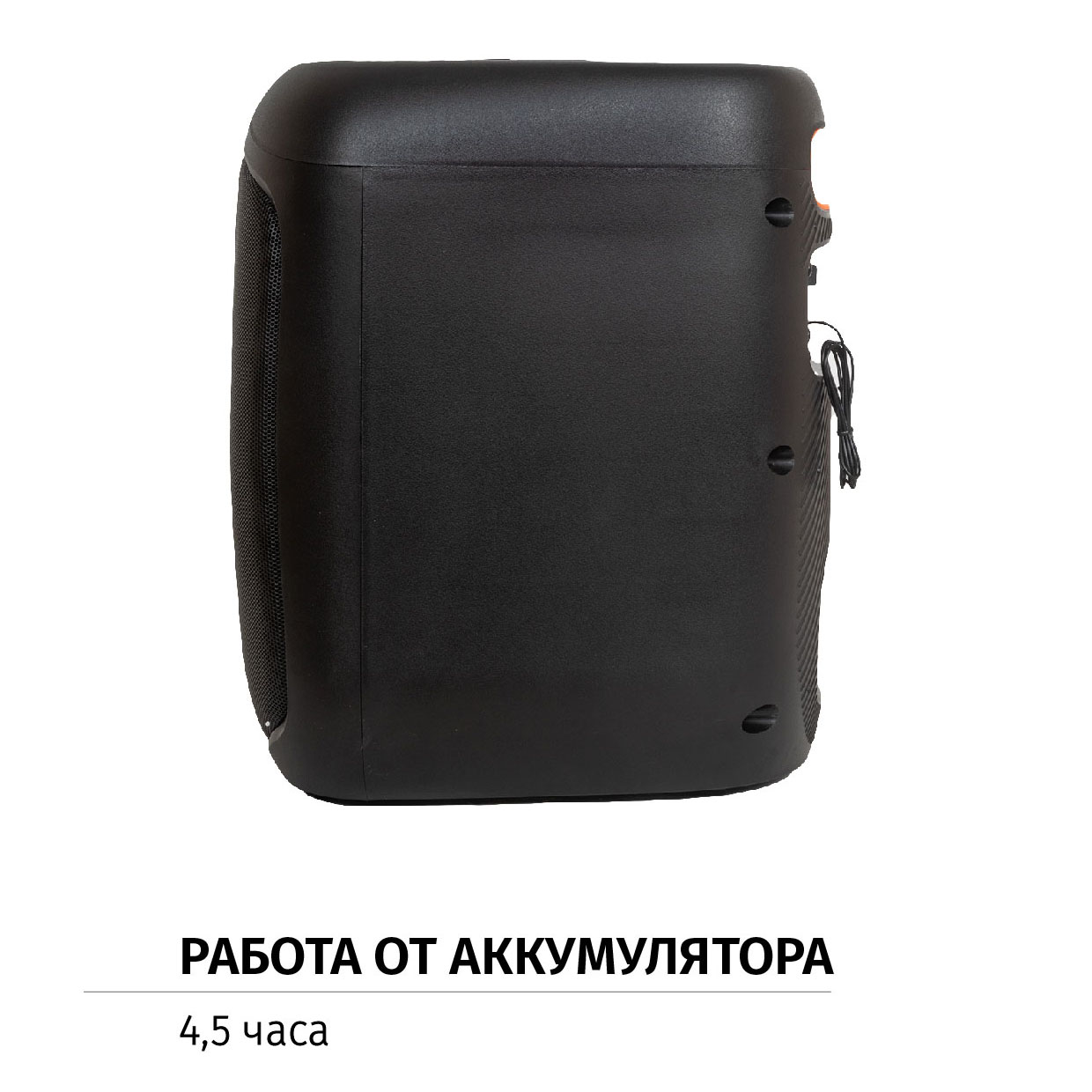Выходная мощность (RMS) 50 Вт Частотный диапазон 50 Гц – 20 кГц Диапазон частот FM тюнера 87,5 – 108МГц Подсветка 7 цветов, 6 цветовых схем Размеры динамиков, Ø низкочастотный динамик 165 мм, твитер 25 мм Беспроводная передача сигнала по Bluetooth да Воспроизведение музыки с носителей памяти USB, TF card Интерфейсы для микрофона, USB, AUX, TF card Функция караоке да Функция регулировки эквалайзера да Функция TWS да Встроенная аккумуляторная батарея 3000 мAч Пульт управления да Размеры 240x240x300 мм. Вес 3,7 кг.