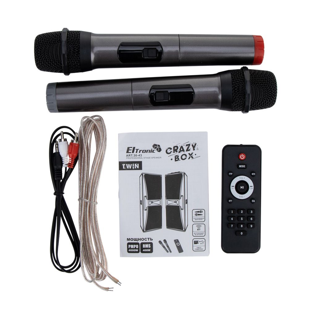 Комплектация: Акустическая система - 2 шт, Микрофон беспроводной- 2 шт, Пульт Д/У, Кабель питания 220V