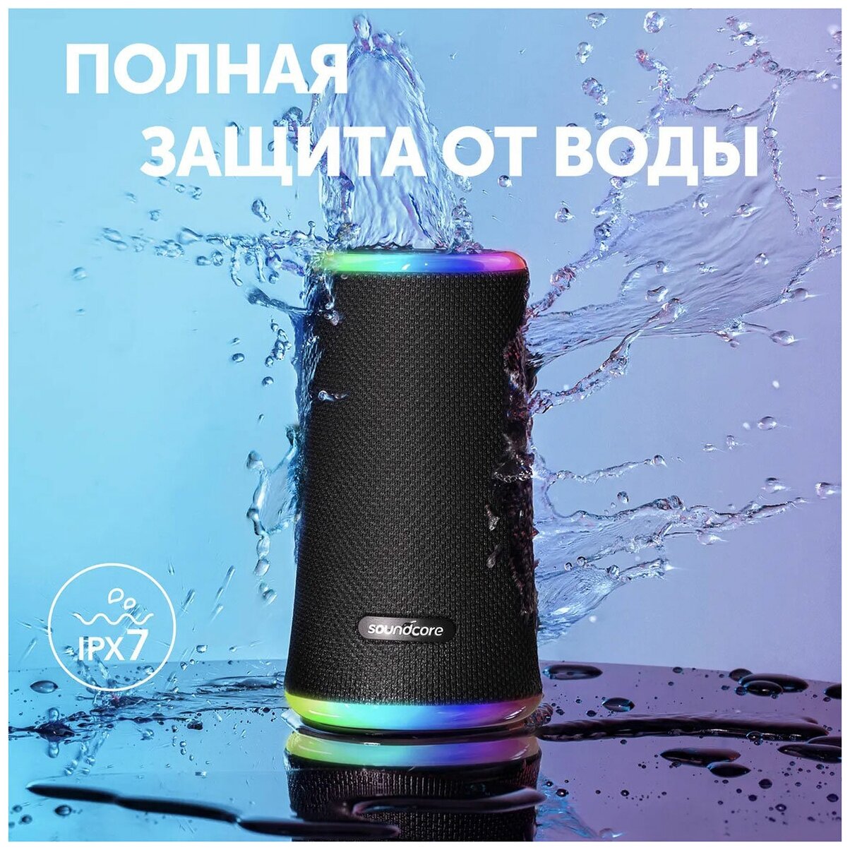 Портативная колонка Anker Soundcore Flare 2 представлена в стильном черном корпусе из металла и пластика с пылевлагозащитой IPX7.