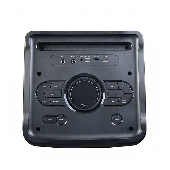 Портативная акустика, AUX кабель, кабель для зарядки, беспроводной микрофон, пульт ДУ, руководство по эксплуатации, гарантийный талон.