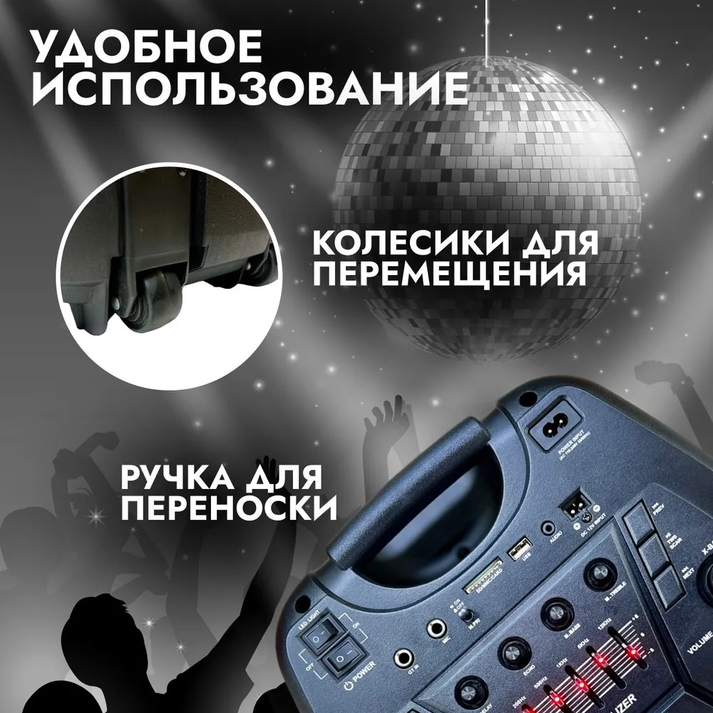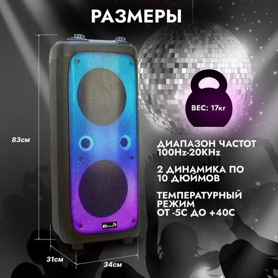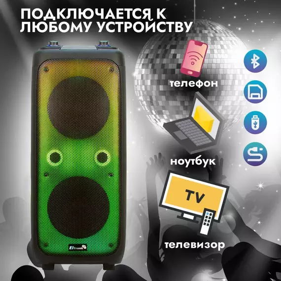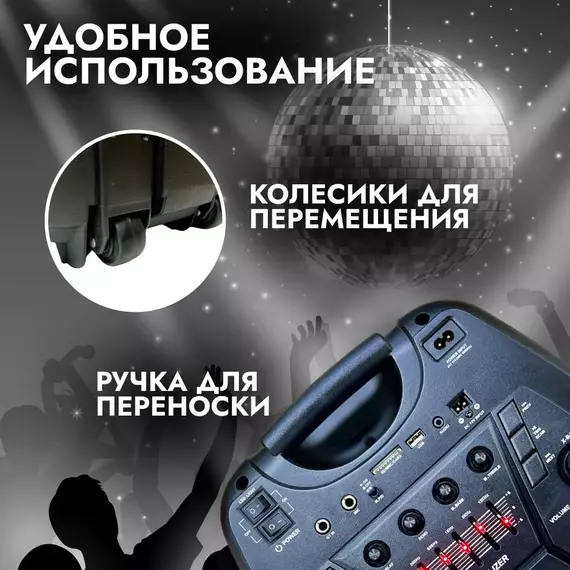 Блютуз колонка, несмотря на свои большие размеры, еще и мобильная. У нее есть удобная ручка и колесики для транспортировки, похожие на те, что вы видели у чемоданов. Это значит, что ELTRONIC 20-62 легко можно доставить к месту проведения праздника.