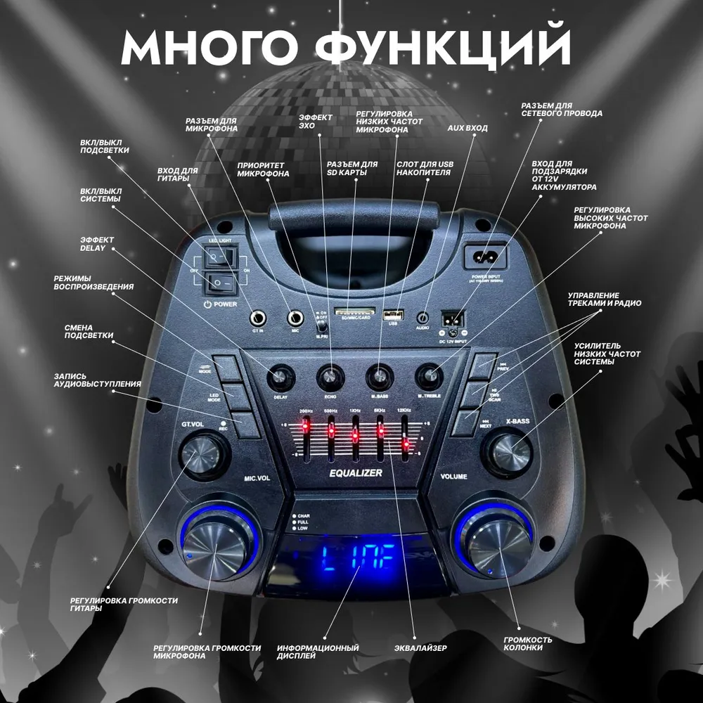 Особенно радует большая блютуз колонка набором функционала. Он впечатлит не только любителя, но и профессионального музыканта. На панели управления, расположенной вверху, можно увидеть не только стандартные кнопки перемотки и проигрывания композиций, но и кнопку записи звука, функцию приоритета микрофона, ручки пространственной обработки для микрофонов, настройку высоких и низких частот, графический эквалайзер, функцию X-BASS и многое другое.