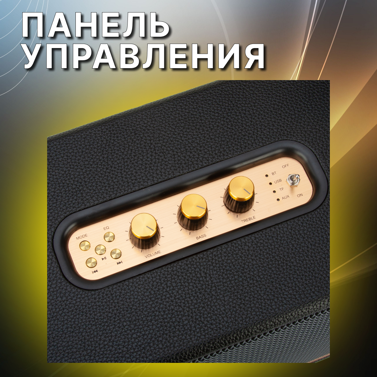 Отметим, что, несмотря на ретро-корпус, начинка у аудиоколонки вполне современная, есть 4 варианта воспроизведения звука: всем полюбившийся Bluetooth, флешка или карта памяти, кабель Aux. Переключение между режимами осуществляется на панели управления переносной аудиоколонки.