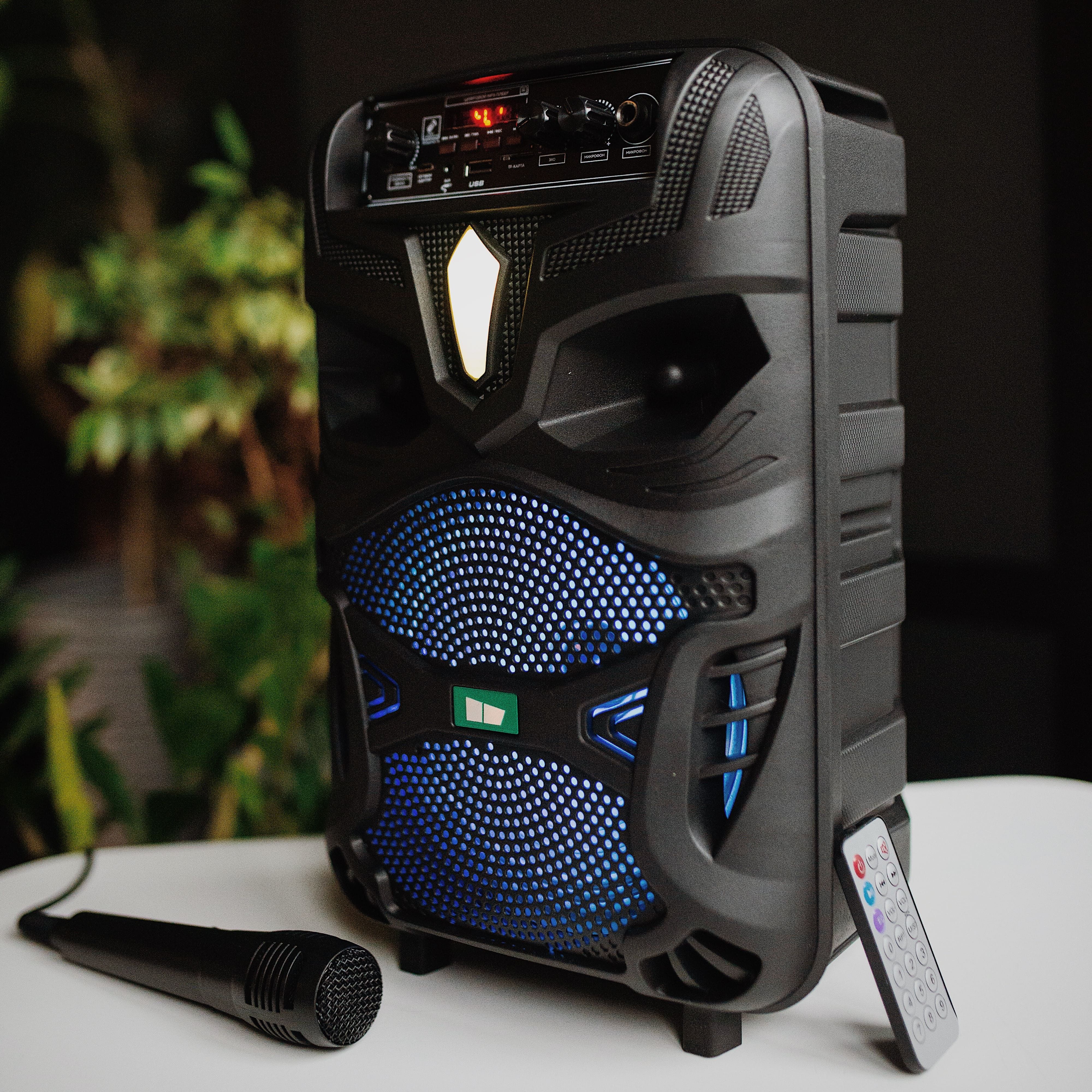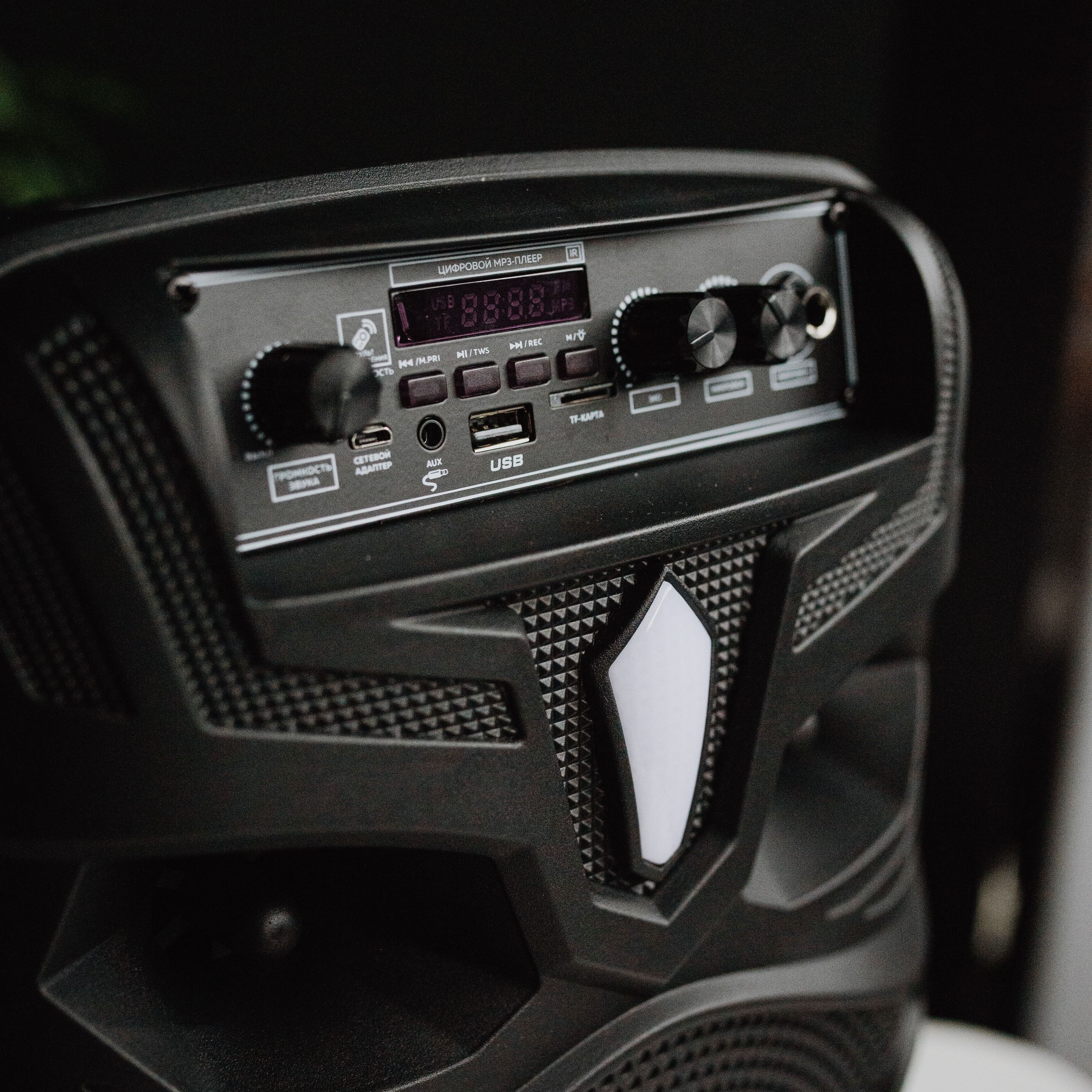 Поддерживает Bluetooth 5.0, TWS, AUX, FM-радио, TF-карты, и имеет вход для проводного микрофона, который входит в комплект! Колонка оборудована ручкой для удобной транспортировки.