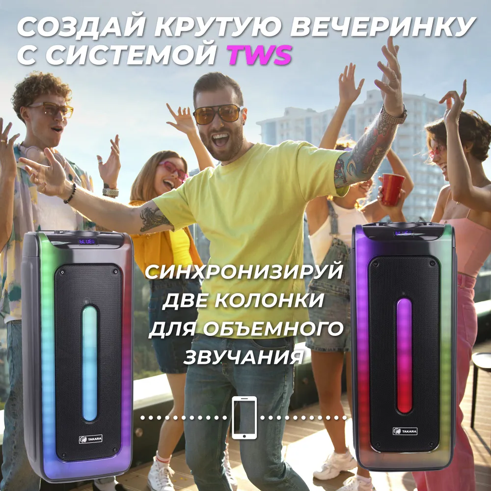 Привлекайте внимание и наслаждайтесь качественным звуком с портативной аудиосистемой TAKARA. Уникальный дизайн, мощные динамики и богатый звук позволят вам создать незабываемую атмосферу в любом месте. Благодаря легкому и компактному дизайну вы можете брать эту аудиосистему с собой куда угодно. Будьте готовы к праздничному настроению и музыкальному сопровождению в любое время!