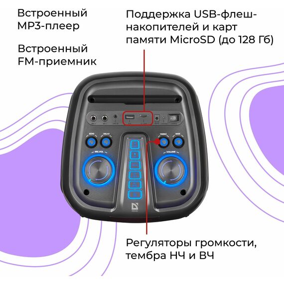 Портативная колонка Defender Boomer 60 60Вт, Light/BT/FM/USB/AUX/MIC: