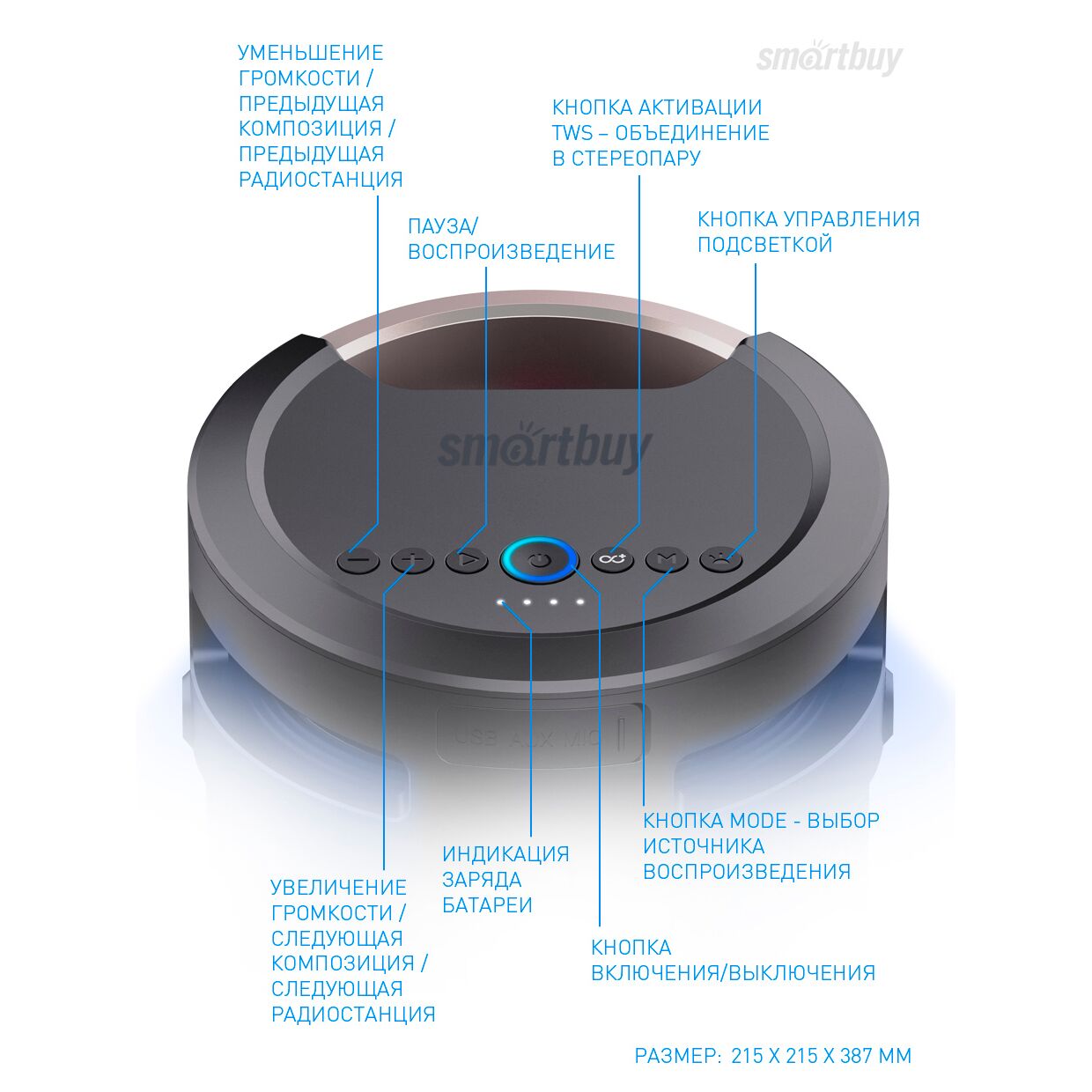 Управление Уровень громкости Кнопка включения Переключение треков Переключение режимов Переключение радиостанций Объединение в стерео пару TWS Возможность подключения микрофона Управление подсветкой
