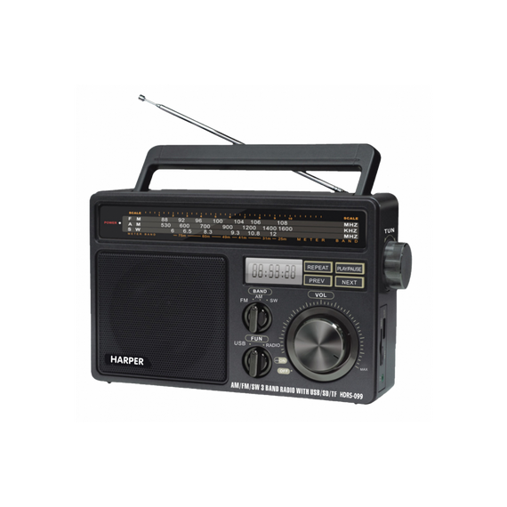 Как бы ни развивались способы доставки медиаконтента, радио всегда остается востребованным. Harper HDRS-099 – отличный представитель класса стационарных радиоприемников. Он выполнен в стиле первых наиболее популярных переносных устройств для приема радиостанций. При этом он поддерживает все современные форматы воспроизведения музыкальных файлов (имеются слоты для подключения карт памяти и порт для USB-дисков), уверенно принимает радиосигналы в диапазонах FM, AM, SW, работает как от сети переменного тока, так и от батарей (аккумуляторов). При желании к радиоприемнику можно подключить наушники (разъем 3,5 мм mini-jack).