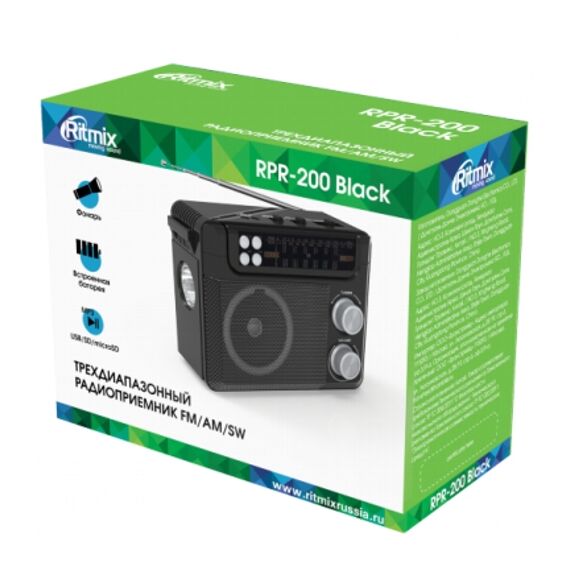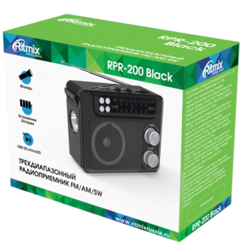 Ritmix RPR-200 — портативный радиоприёмник в классическом стиле. Принимает радиопередачи во всех трех основных диапазонах, FM, АМ и расширенном SW от SW1 до SW9. Воспроизводит MP3-файлы с карт памяти SD, Micro SD, USB-флэш или через AUX-аудио вход. Имеет встроенный фонарь, встроенный заряжаемый аккумулятор, шнур питания / зарядки от сети 220В, удобный отстегиваемый ремень для переноски.