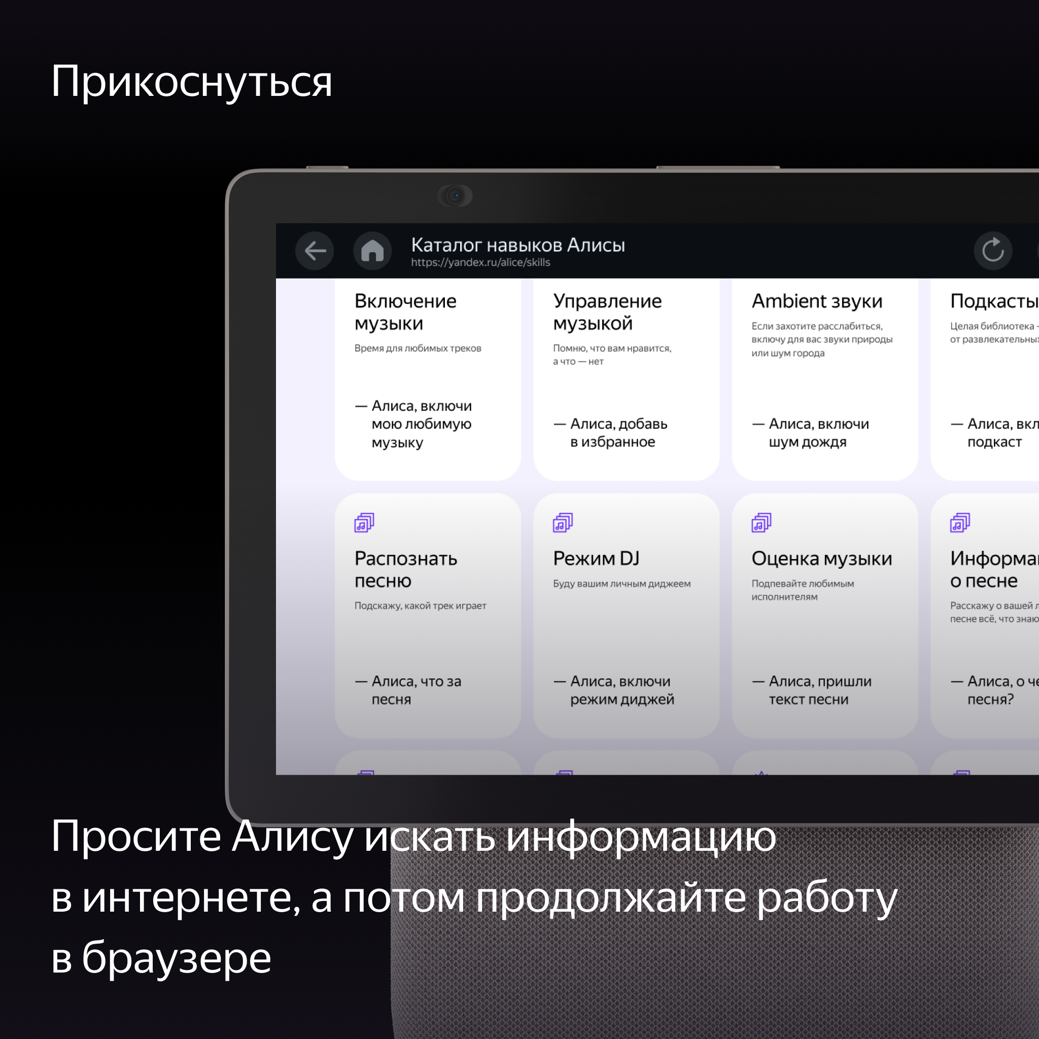 Просите Алису искать и включать музыку, фильмы или сериалы¹, а потом управляйте контентом на экране касаниями: перематывайте, ставьте на паузу и выбирайте нужное. Смотрите телеканалы. Задавайте Алисе вопросы — и не только слушайте её ответы, но и смотрите их на экране. Или пользуйтесь браузером.