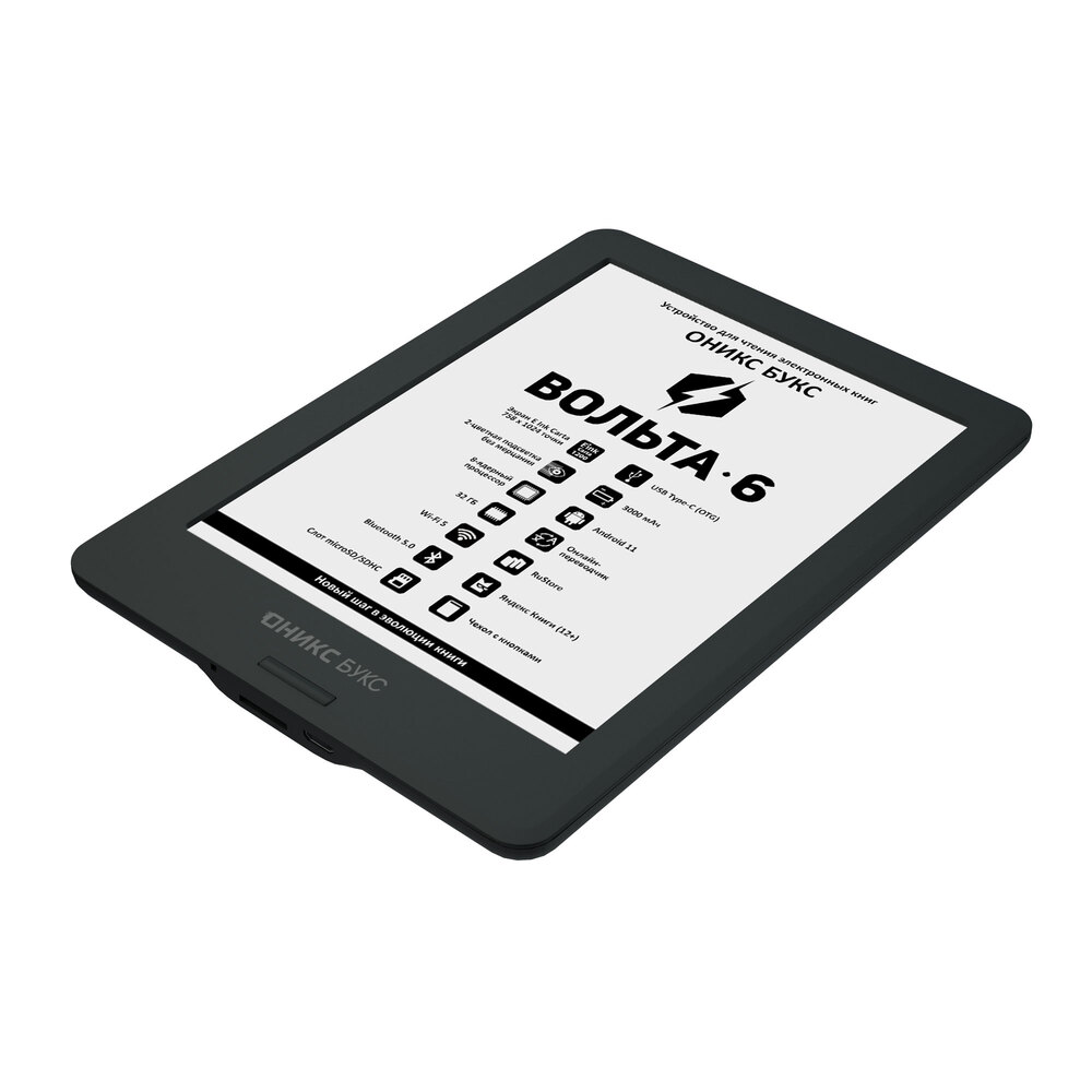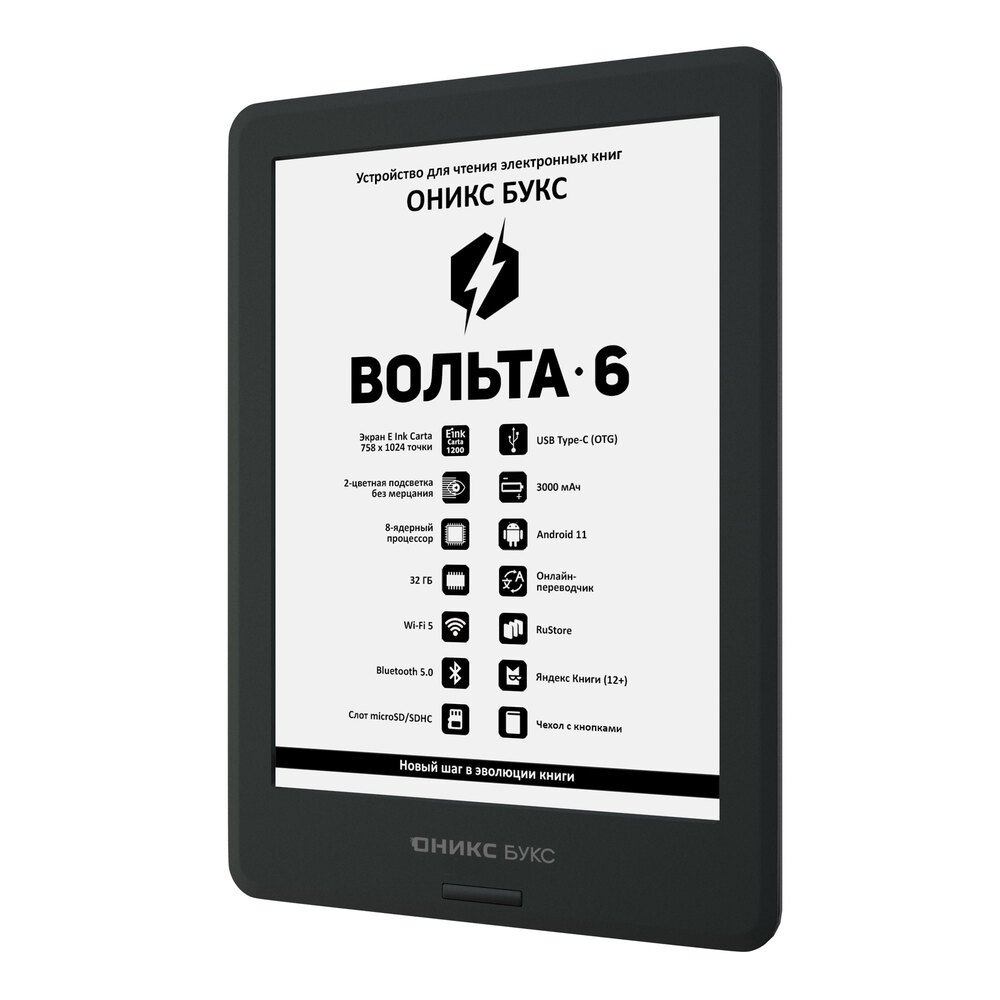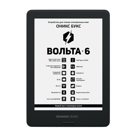 ОНИКС БУКС Вольта 6 — компактное устройство для чтения электронных книг, оборудованное 6-дюймовым экраном E Ink Carta (Carta 1200) с подсветкой и сенсорным управлением. Современный 8-ядерный процессор обеспечивает высокую скорость работы ридера, а 32 ГБ твердотельной памяти в сочетании со слотом microSD позволяют хранить большое количество книг и документов непосредственно на устройстве. Модель оборудована двухдиапазонным модулем Wi-Fi, позволяющим выходить в Интернет и использовать различные сетевые сервисы. Поддержка Bluetooth дает возможность подключать беспроводные устройства, включая наушники и колонки. Благодаря операционной системе Android 11 можно устанавливать на ридер различные сторонние программы. На ридере предустановлен магазин приложений RuStore, с помощью которого можно безопасно скачивать, покупать и обновлять приложения. Аудиоплеер позволяет прослушивать аудиокниги и музыку, а функция TTS - озвучивать текстовые файлы. На ридере предустановлено множество полезных приложений, включая онлайн библиотеку Яндекс Книги (12+). В комплекте с Вольта 6 поставляется защитная обложка с удобными кнопками управления на боковой панели.