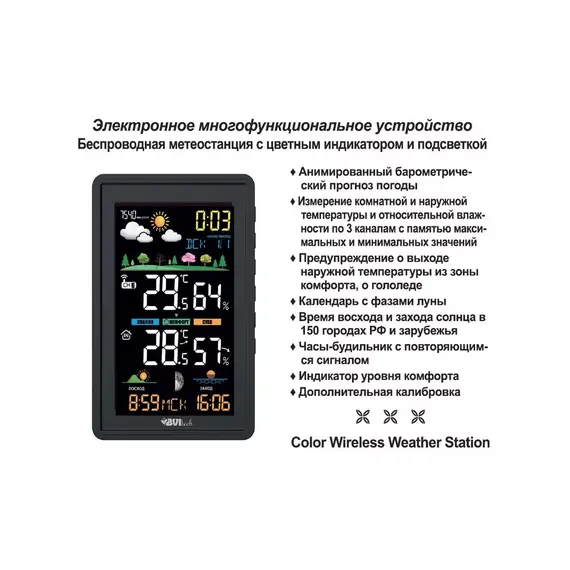 Дополнительные функции: Прогноз погоды, Часы, Сохранение температурных значений, Регистрация макc/мин. значений температуры, Лунный календарь, Календарь, Будильник