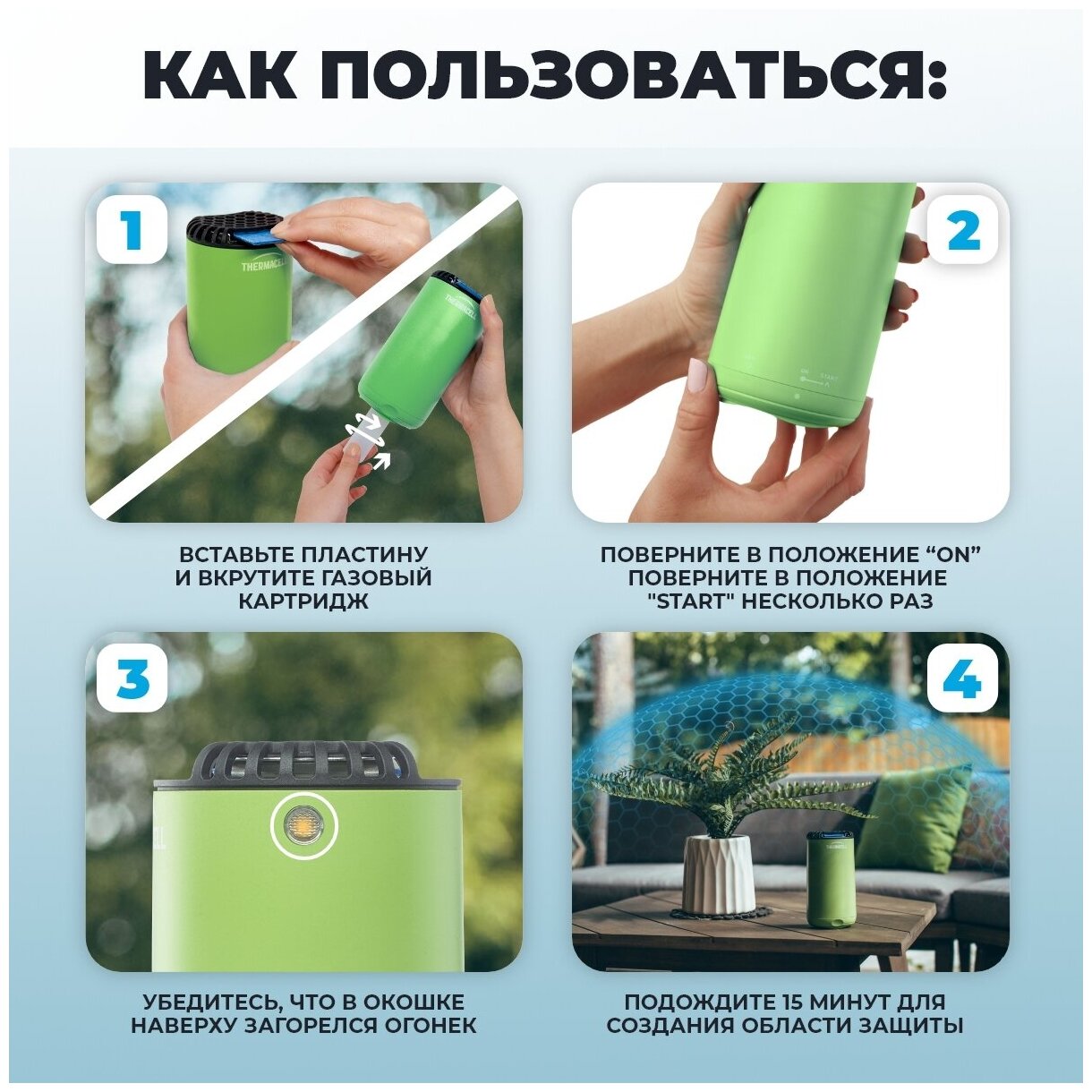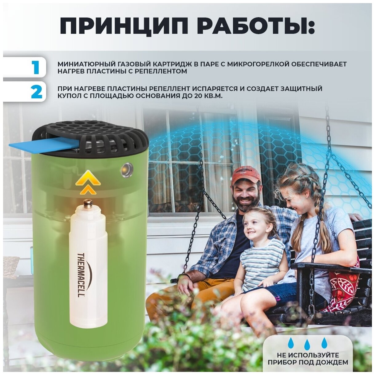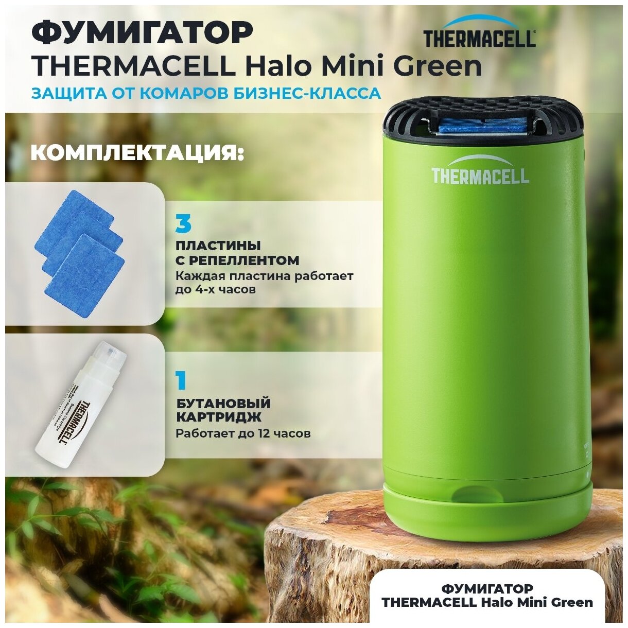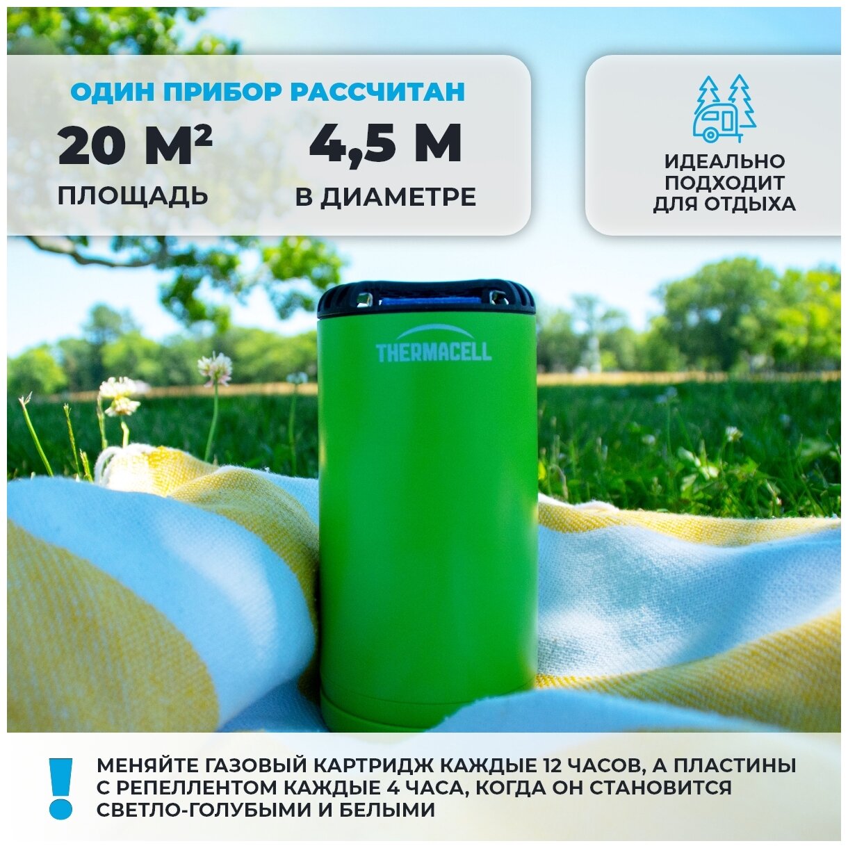 Противомоскитный прибор ThermaCell Halo Mini Repeller Green MR-PSG используется на свежем воздухе. Отгоняет насекомых на площади до 20 кв.м. Пластина с репеллентом действует до 4-х часов, бутановый картридж - до 12.