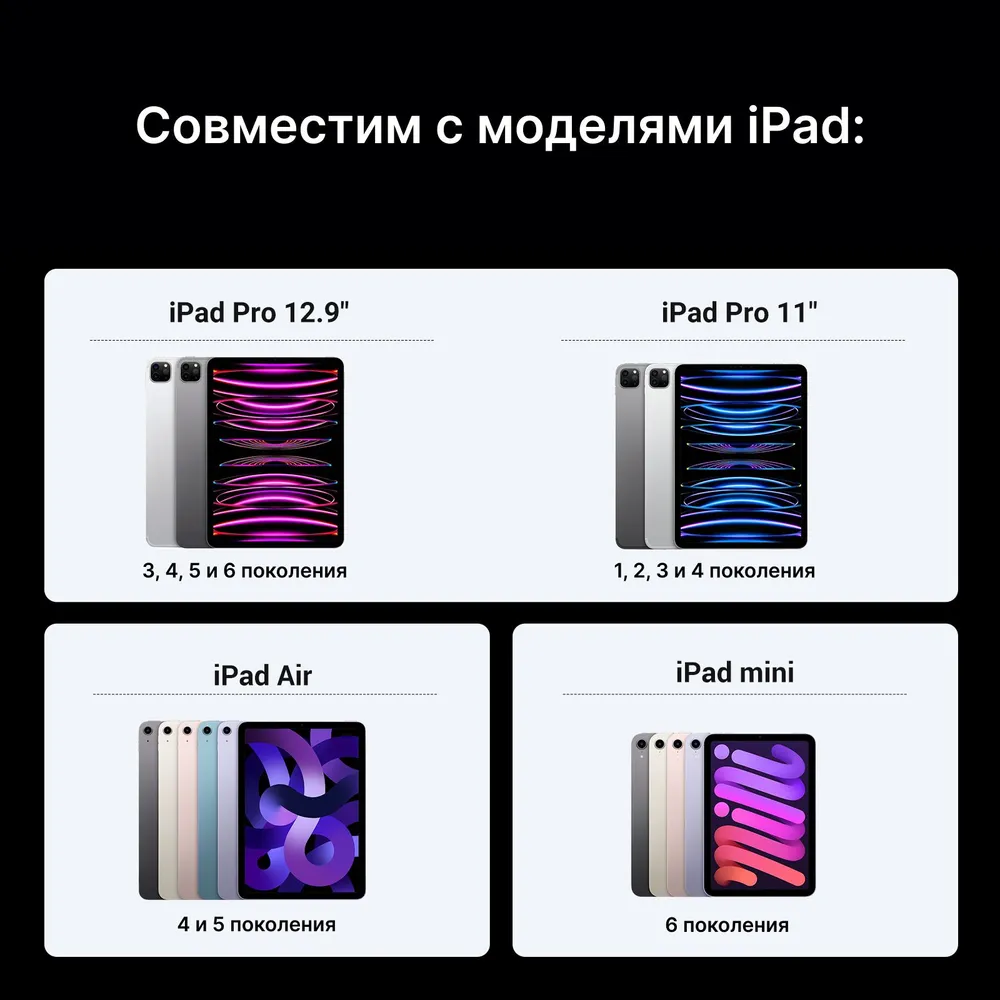 Совместимость: iPad Pro 12.9-inch (6th generation), iPad Pro 12.9-inch (5th generation), iPad Pro 12.9-inch (4th generation), iPad Pro 12.9-inch (3rd generation), iPad Pro 11-inch (4th generation), iPad Pro 11-inch (3rd generation), iPad Pro 11-inch (2nd generation), iPad Pro 11-inch (1st generation), iPad Air (5th generation), iPad Air (4th generation), iPad mini (6th generation)