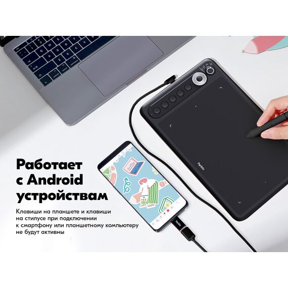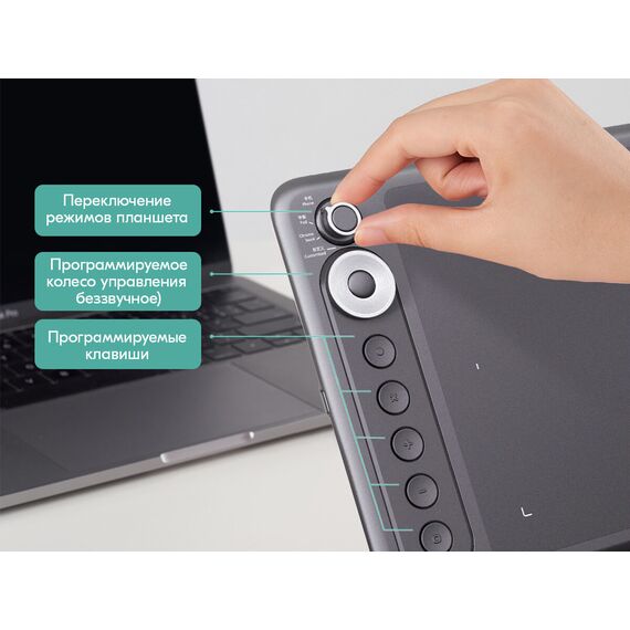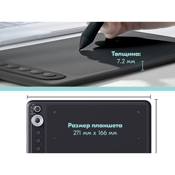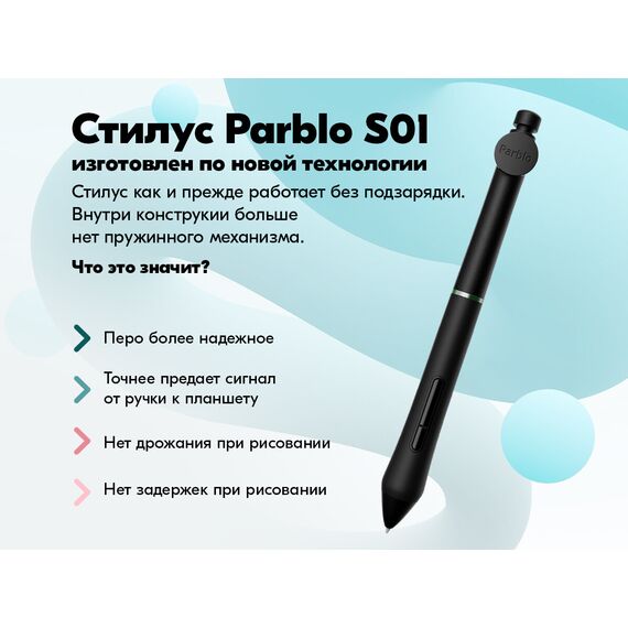 Новый стилус S01. Его особенности: полностью устранен джиттер эффект (эффект подрагивания курсора) при рисовании. Изменена конструкция фиксирования наконечника пера - теперь наконечник неподвижен, это точнее передает нажим пера. Программируемое Dial-кольцо.Физический переключатель режимов планшета.