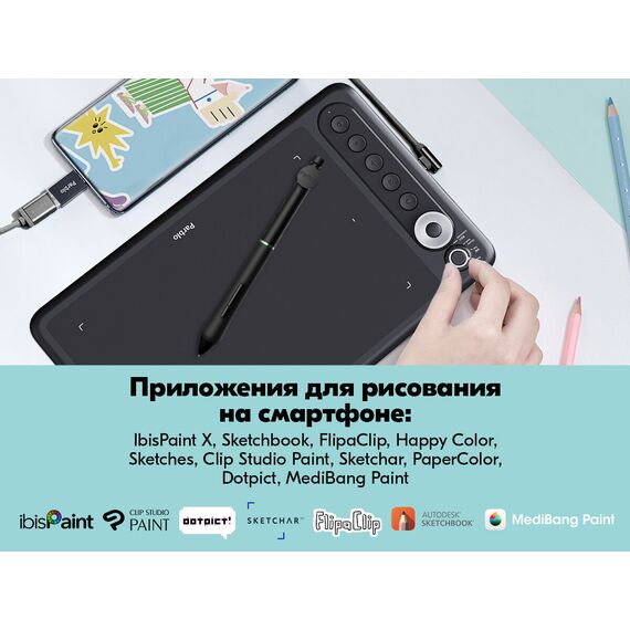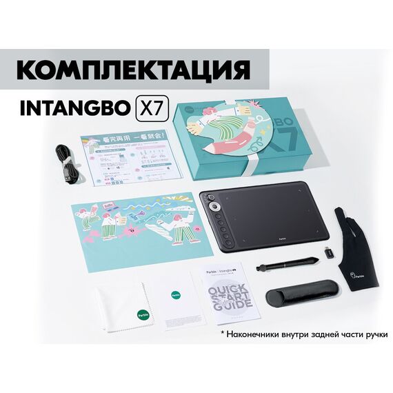 Графические планшет Intangbo X7, Беспроводное перо S01, Кабель USB-C, Чехол для стилуса, Сменные наконечники для пера, OTG переходник на Type-C, Руководство по эксплуатации, Гарантийный талон, Перчатка PR-01, DIY стикер