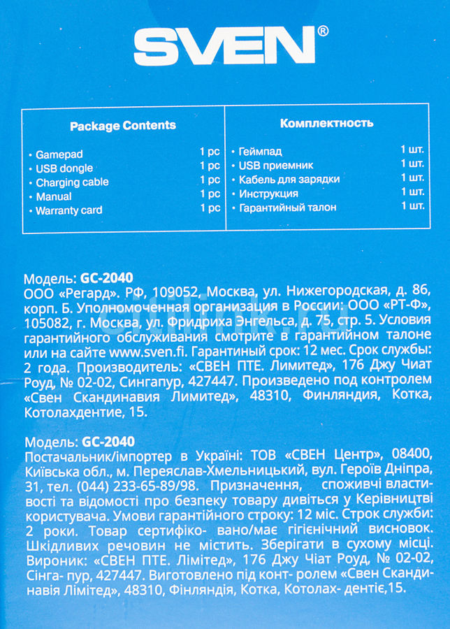 Питание беспроводного геймпада SVEN GC-2040 производится за счет встроенного ионо-литьевого аккумулятора. Осуществляется поддержка режима X-Input. Предусмотрены четыре оси позиционирования: газ, тормоз, рысканье и тангаж. Все действия выполняются плавно и точно, без искажений или скольжения. Конструкция оснащена восьмипозиционным джойстиком, двумя мини-джойстиками и 11 кнопками управления. Soft-touch покрытие обеспечивает уверенный контроль во время игры. Работа выполняется в цифровом и аналоговом режимах.