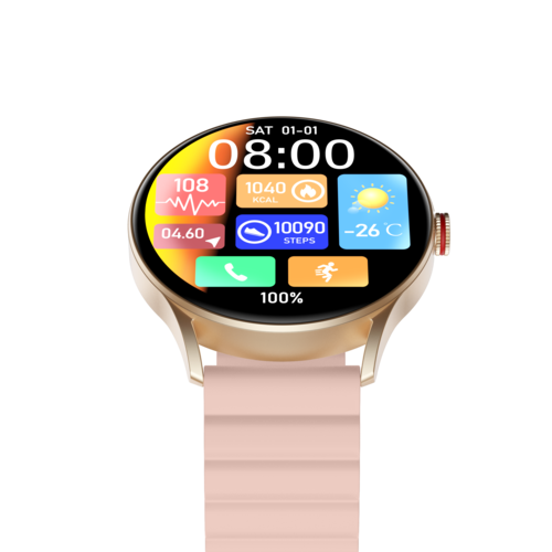 Смарт-часы iMiKi TG1 выполнены в золотистом металлическом корпусе с защитой от пыли, влаги и воды IP68. Силиконовый розовый ремешок комфортно облегает запястье. На круглом дисплее диагональю 1.43 дюйма в любых условиях освещенности передается четкая контрастная картинка.