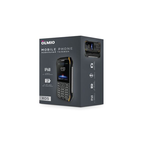 Сотовый телефон Olmio X05 станет отличным выбором для самых экспрессивных и экстремальных натур. Он облачен в пластиково-металлический корпус со степенью влаго- и пылезащиты IP68. Кнопки клавиатуры устройства крупные и приятные на ощупь. Экран модели обладает диагональю 2.4 дюйма и разрешением 320x240 пикселей.