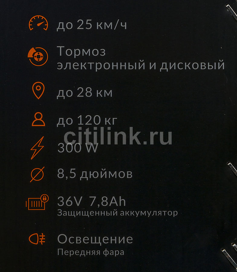 максимальная скорость: 25км/ч; запас хода: 25км; емкость батареи: 7800mAh