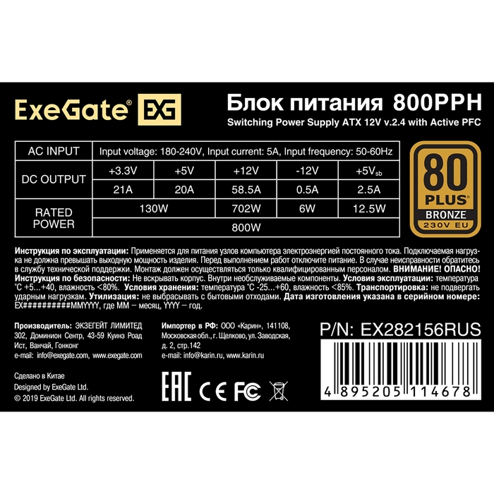 Блок питания ExeGate 800PPH EX282156RUS 80 Plus Bronze 800W (ATX, APFC, КПД 89 (80 Plus Bronze)