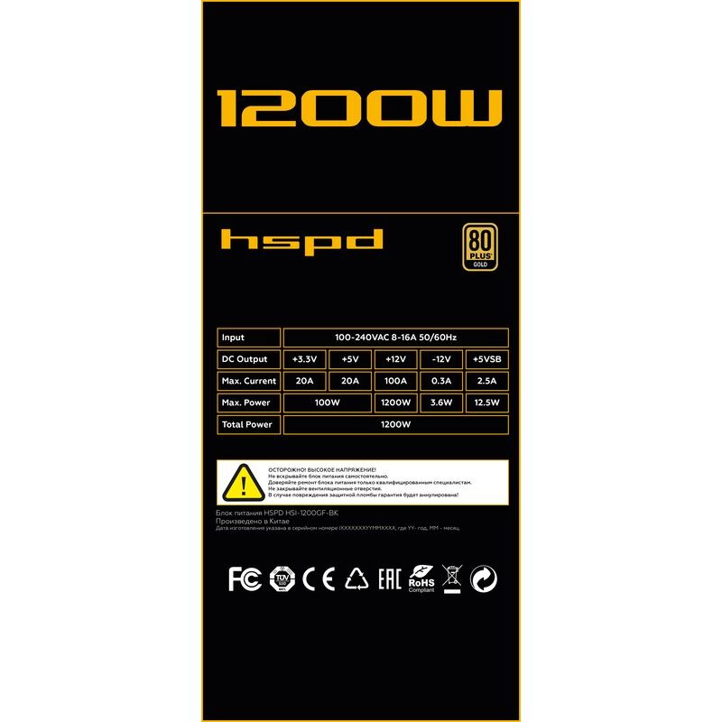 Блок питания HSPD HSI-1200GF-BK 1200W 80+ Gold (ATX, 3.1, PCIe 5.1, Full modular, 1x24(20+4)pin 600mm, 2xCPU 8(4+4)pin 700mm, 2xPCIe*2)