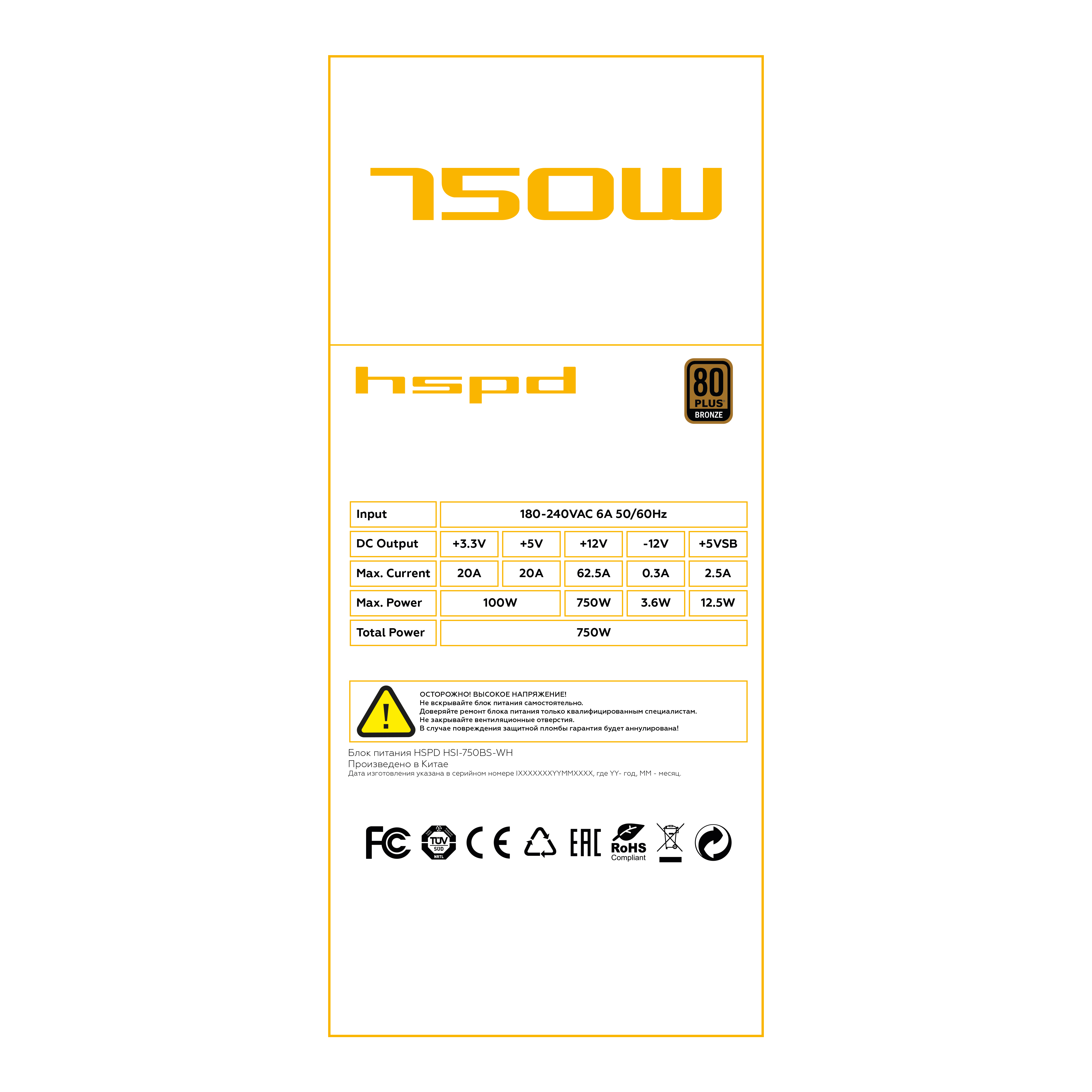Блок питания HSPD HSI-750BS-WH 750W 80+ Bronze (ATX, 2.31, Semi-modular, 1x24(20+4)pin 550mm, 1xCPU*2 8(4+4)pin 600+150mm, 1xPCIe*2