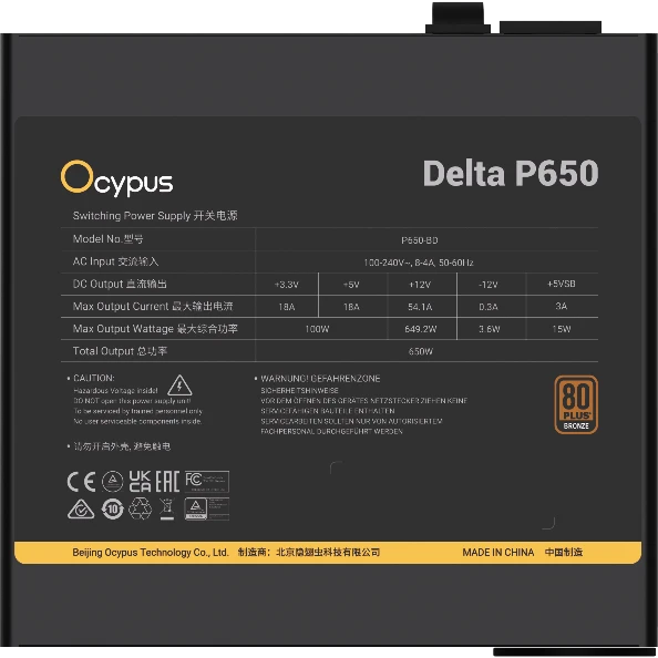 Блок питания Ocypus Delta P650 (Delta-P650-B1FDBK024X-EU) 650W (ATX, 80+ Bronze, APFC, 20+4 pin, 120mm fan, PCI-E 6+2Px3, 8xSATA)