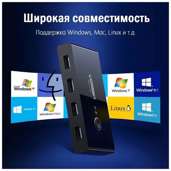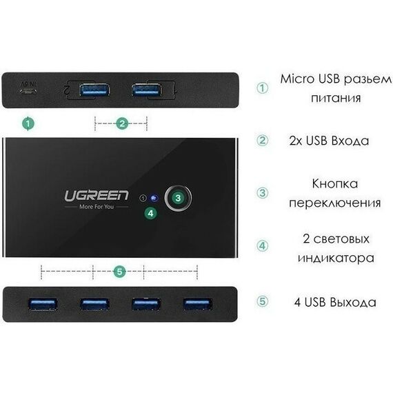 Разветвитель портов UGREEN US216 (30768) 2 In 4 Out USB 3.0 Sharing Switch Box. Цвет: черный